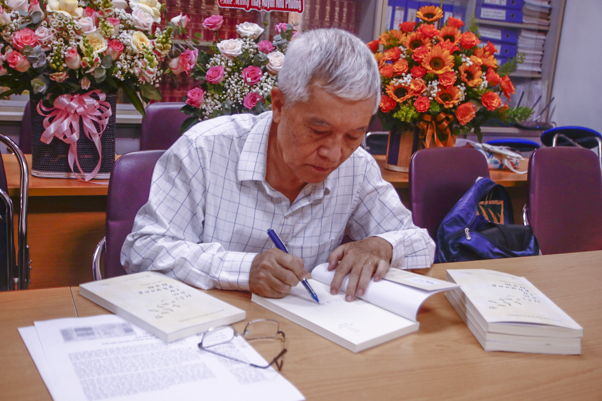 Trong văn phòng khoa nơi GS Huỳnh Như Phương từng gắn bó nhiều năm, rất đông sinh viên và bạn văn đã tề tựu về để mừng ông ra mắt sách.